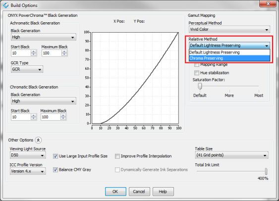 Saturation Factor - This option increases the saturation of the calculated ICC values, with chroma increase weighted more than lightness change. The default setting is [More] for most of the ICC build option presets.