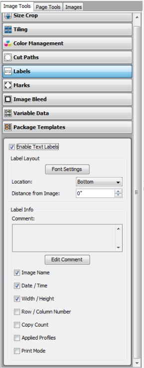 The Labels option in the Image Tools allows you to print a label for your image. [Labels] contain information about the image such as mode, date and time, profiles used, and even comments. To use Labels, click the [Labels] option under the [Image Tools], and then check [Enable Text Labels]. You can set the following options using Labels: