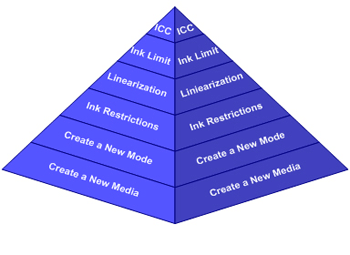 The [Ink Restriction] is the process of determining maximum amount of “usable ink” per individual printer channel that a media coating can accommodate without print problems. Print problems can consist of wet ink, bleed, mottling, cracking, smudging or flaking. The [Ink Restriction] also can set the maximum available ink from which to achieve an ink and media’s potential gamut. Keep in mind that by maximizing individual channels, two or more combined channels may also result in artifacts. The [Ink Limit] of profiling step is used to address these combinations of ink channels (See Ink Limit).