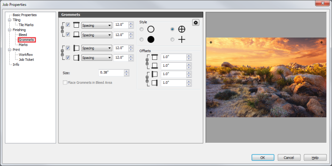Spacing – This allows you to specify an approximate distance between grommet marks on a side of the image. The first and last mark locations will be determined by the offsets one either side, then marks will be added between them as needed, using the distance specified as a guide.