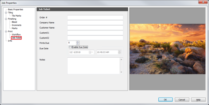 The Job Ticket option in Advanced Quick Sets allows you to record information such as Order number, Company and Customer name, Prints Due, Due Date, and any other notes associated with the job.