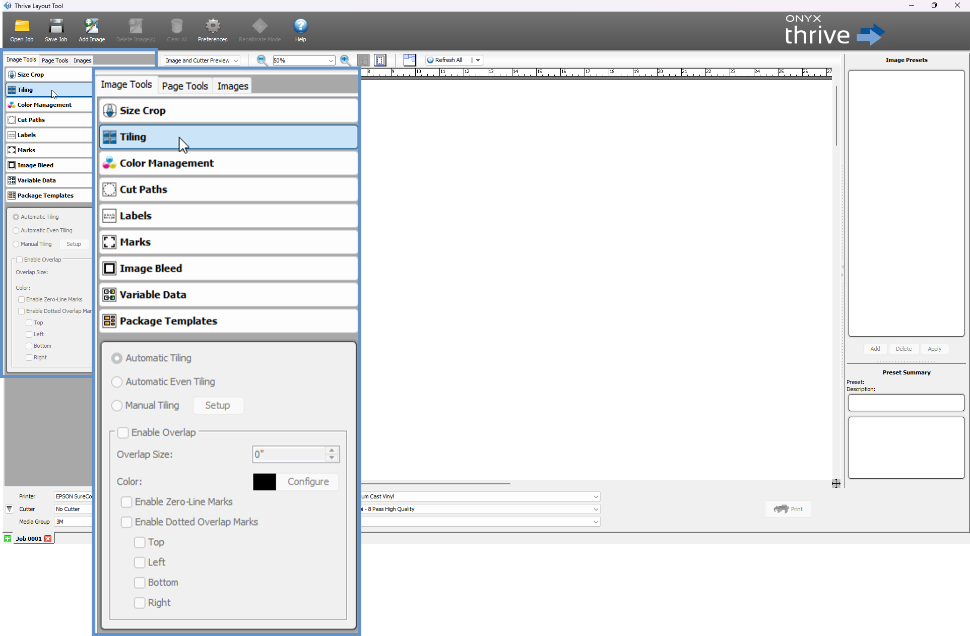 On the right side of the Layout Tool, you’ll find the Image Presets panel — a powerful feature that allows you to save and apply predefined image settings for consistent, repeatable results across multiple jobs.