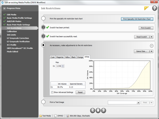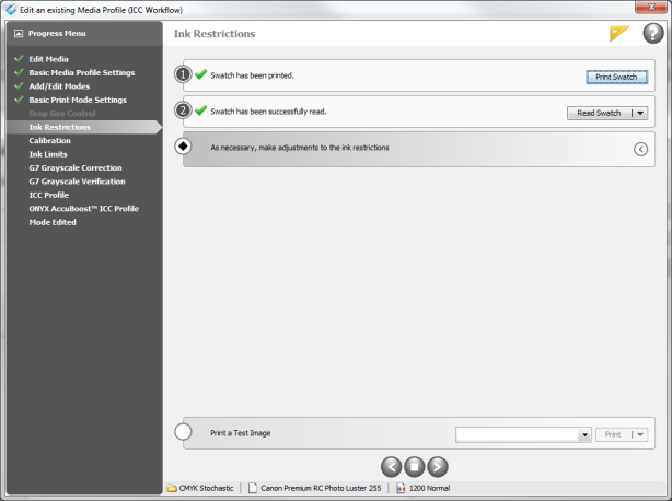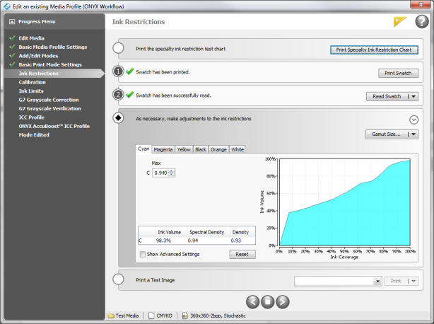 The simple process of [Print, Read, Next…] is recommended in order to save time. This method takes the guess work out of ink restricting for the novice by using swatch measurements and preset targets to determine optimum settings, allowing the user to quickly profile.