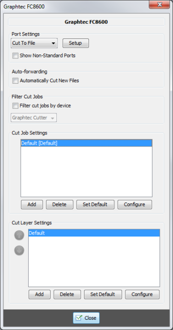 NOTE: Because the settings for each cutter are different, consult the user manual for your cutter for assistance configuring your Port Settings and Device Settings.