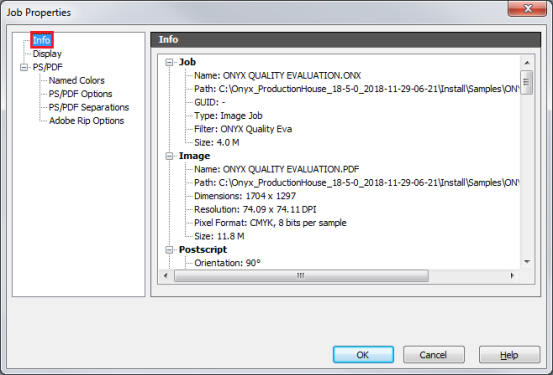 The Information in the Job Properties contains all the information about your job including settings, size, image data, and other information.