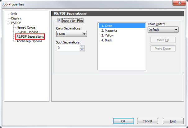 A PS/ PDF Separation Files are a format that has separate data for each color channel. There may be a single file or several different files (one for each color channel). Configuring the options for PS/PDF Separation Files allows RIP-Queue to correctly process these files.