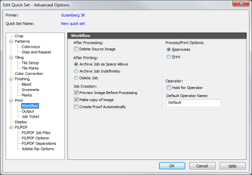 The [Workflow] options (Figure 1) in the Advanced Quick Set Options and Process/Print Setup of Job Editor allows you to determine how jobs are handled in RIP-Queue.