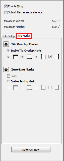 Check [Enable Tiling] to use the options under the Tiling tab. Any portion of the image larger than the width of your page size is moved to another tile. When [Enable Tiling] is disabled, the image size is restricted to the maximum width defined under [Maximum Print Area:] in the “Preview and Size” tab.