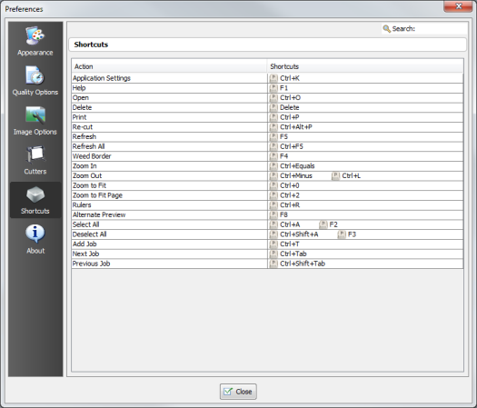 The Shortcuts option in the “Preferences” window lists all the shortcuts in CUT-Server. The first column lists the 「Action」, the second lists the key stroke [Shortcut] for the [Action].