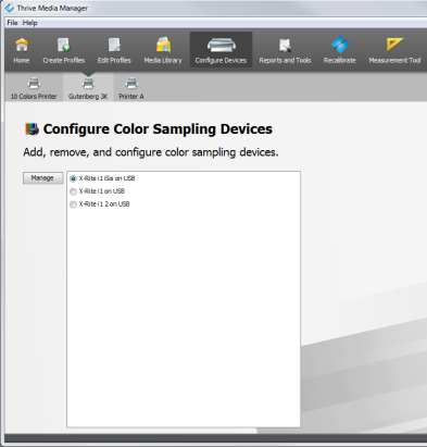 From the Media Manager Toolbar, click Configure Devices icon, then select [Configure Color Sampling Devices] button to add or configure a color sampling device. (Figure 1) Click [Manage] button after selecting an existing device, or to add a new one clicking [Add…] button in the “Measurement Devices” dialog. Use the “Measurement Devices” dialog (Figure 2) to add, remove, and configure the devices you use to read in densitometric or colorimetric data. You must add a device before printing calibration or profile swatches.