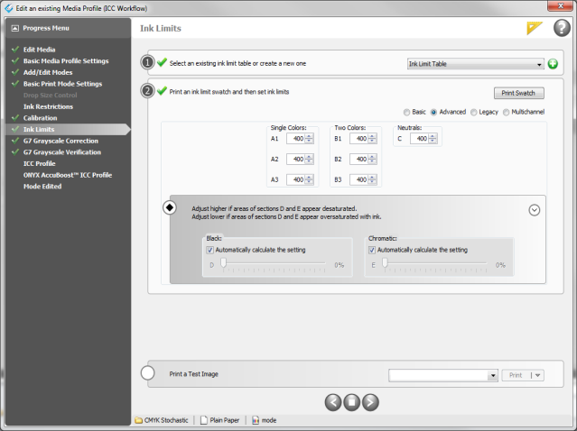 It is recommended that the ink limit swatch be printed again after setting the ink limits. If you notice a drop in color near the point of your chosen Ink Limit you can use the [Black] and [Chromatic] sliders to fill in this area. These sliders help by adding in an amount of the color reduced in the Ink Limit, equal to the amount of black ink needed to achieve similar darkness. The [Chromatic] slider performs a similar function for the CMY Gray component.