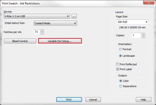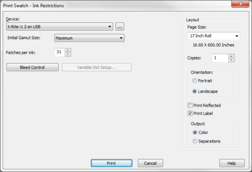 Page Size - Select the page size that you want to print the swatch with. Copies - Set the number of copies. Orientation - Select [Landscape] or [Portrait]. [Landscape] is generally used because it reduces media waste. Print Reflected - Select the [Print Reflected] check-box to print a mirror-image of the swatch. This option is useful when printing on backlit or transparency media. Print Label - Select the [Print Label] check-box to print a text label after the image. You may wish to use this option to record what settings the swatch was printed with. Output - Choose the type of output you want printed.