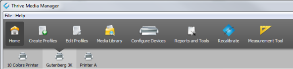 Media Manager uses Wizard-driven tasks to guide you. These Wizards organize each task into logical steps. You can navigate to different tasks in Media Manager using the Toolbar displayed across the top of the main window. Selecting Your PrinterMedia Manager lists your available printers below the Toolbar. To change your current printer, click the printer you would like to use from the list. |
