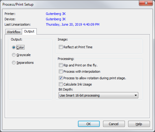 The [Output] option (Figure 1) in Process/Print Setup of Job Editor allows you to control how jobs are processed.