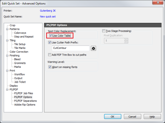For example, if you created an image with specific color names for specific colors and saved the file as a PDF with the new colors and names stored in the PDF file, you could then use the Color Matching Table to help match those colors in RIP-Queue. By using the Color Matching Table, the colors you specified by name will be mapped directly to the colors that should be printed.
