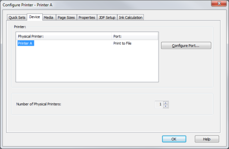 The [Device] tab of the "Configure Printer" dialog determines the following items: