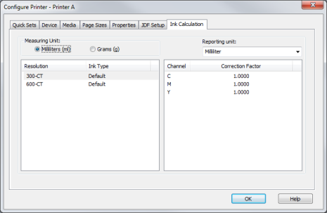 Ink Calculation helps determine the ink usage for your printers. The Ink Calculation tab of the Configure Printers dialog allows you to define the [Reporting Unit] and the [Correction Factor].