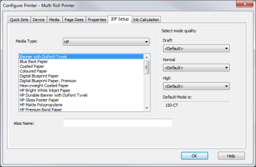 There are 3 basic mode qualities to specific print mode on a media by media basis and you can set them from pull down menu for each specific media. If desired, you also can set an alias for example “Draft 600” for each specific media type (Figure 1). • Draft – Low resolution • Normal – Standard resolution • High – High resolution