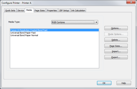 The Media tab in the Configure Printers dialog (Figure 1) allows you to control your media settings as well as manage, import, and export media.