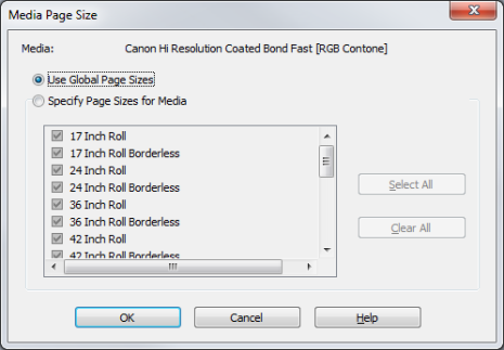 The [Page Sizes...] option allows you to determine which page sizes you want to use for your media. Clicking the[ Page Sizes] button opens the "Media Page Size" dialog (Figure 2).