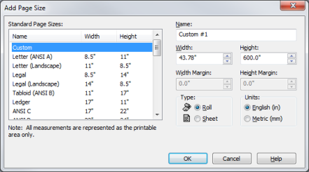 - If you choose a "Custom page size", set the Type, Units, Width, and Height. If you choose a Standard size, edit the [Width Margin] and [Height Margin].