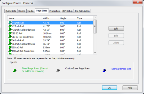 To remove a page size, highlight it and click [Delete] button.