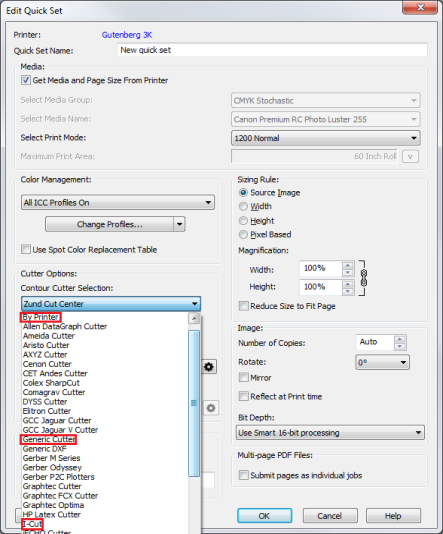 - Open the Edit Quick Set dialog by either clicking Configure Printer > New or Edit Quick Sets > Edit.Click the first button to create a new Quick Set; the second button to edit an existing Quick Set. Select your cutter from the Contour Cutting drop-down menu. If your cutter is not available, select [Generic Cutter].
