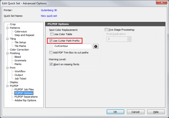 - In the “Advanced Options” dialog, select the [PS/PDF Options] from the PS/PDF tree and enable the [Use Cutter Path Prefix] option (Figure 2). The prefix must exactly match the prefix you entered in step 6 of Creating a Cut Path. If it does not, you will not be able to create the cut path. In this case, leaving this as the default setting (CutContour) is strongly advised.