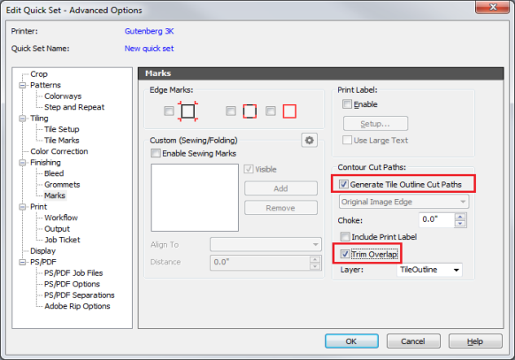 - Select the [Marks from the Finishing tree, and select additional options. You can choose to [Generate Tile Outline Cut Paths] or use ]Trim Overlap] (Figure 3).