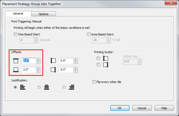 In the “Placement Strategy” dialog, select the [General] tab, and set the Top Offset to 2 inches, the Bottom Offset to 2 inches. This adds an extra margin that the cutter needs when moving the media back and forth.