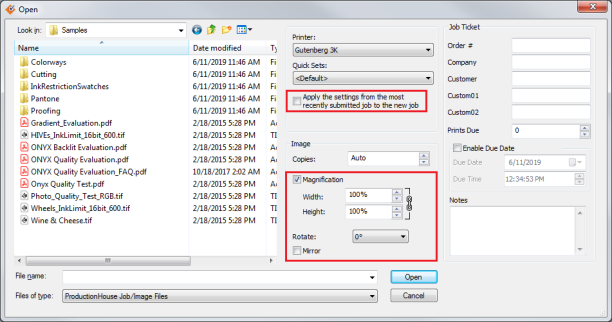 In the “Open” dialog, you will see some of the same options as RIP-Queue (Figure 1). You can also select the box to apply the same settings to this job as the previous job. (Figure 2)