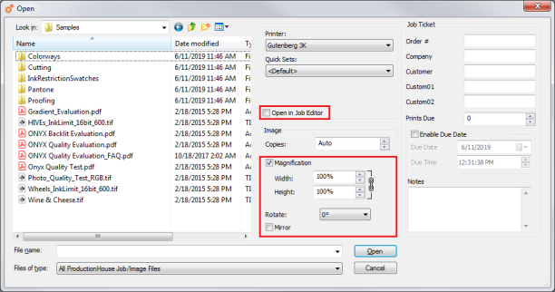 - Open in Job Editor – Check this option when you want to open an image in Job Editor. (NOTE: This option is showed in RIP-Queue’s Open dialog)