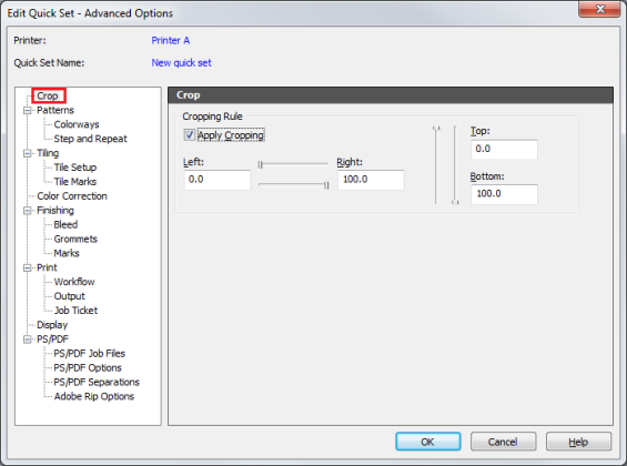 Cropping defines an area of your image that will not be printed. The [Crop] (Figure 1) in the Advanced Quick Sets Options allows you to automatically crop any job that uses that Quick Set.