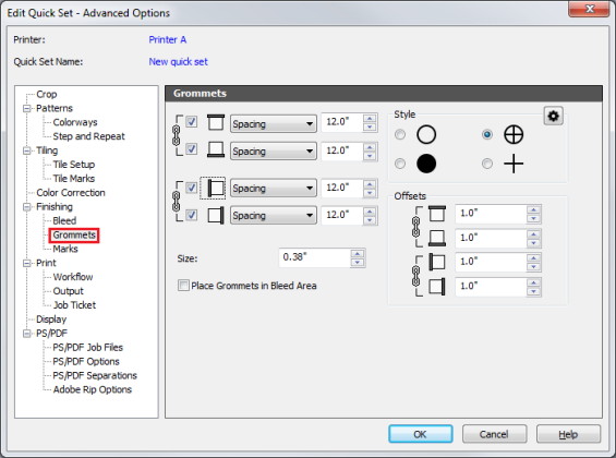 Spacing – This allows you to specify an approximate distance between grommet marks on a side of the image. The first and last mark locations will be determined by the offsets one either side, then marks will be added between them as needed, using the distance specified as a guide.