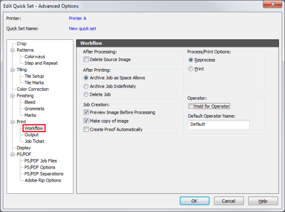 The [Workflow] options (Figure 1) in the Advanced Quick Set Options and Process/Print Setup of Job Editor allows you to determine how jobs are handled in RIP-Queue.