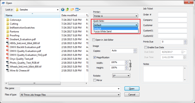 You can apply a Quick Set to a job by selecting the proper Quick Set in the "Open" dialog (Figure 4). This can be done from RIP-Queue or Job Editor.