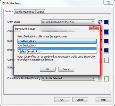 DeviceLink profiles directly encode a transform from two profiles, such as an input and output profile. This can result in more accurate profiles, and the ability to use different profiles for CMYK and RGB images and elements, even from the same PDF file.