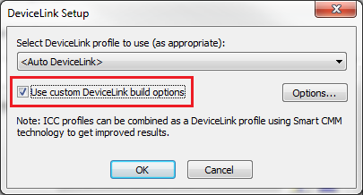 • Auto DeviceLink+ - DeviceLink profiles are automatically built as needed, using the configured settings in the ICC Profile Setup and the mode's ICC output profile. As long as the DeviceLink profiles remain in the mode, they only need to be built once.