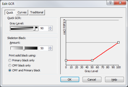 The "Edit GCR" dialog uses three types of editing controls to set the GCR settings: Quick, Curves, and Traditional. Each method is a different way to edit the GCR information. Click the appropriate button at the top of the "Edit GCR" dialog to choose either [Quick], [Curves], or [Traditional]. You cannot use a combination of these methods; switching from one to another method will cause the previous changes to be lost.