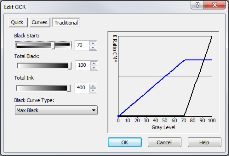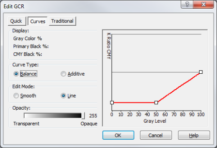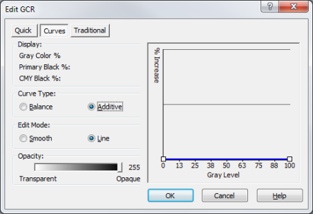 - Black Curve Type - The [Black Curve Type] sets the type of curve used to add K to the GCR ratio of K and CMY. Changing this curve also modifies the Gray Balance (blue line).