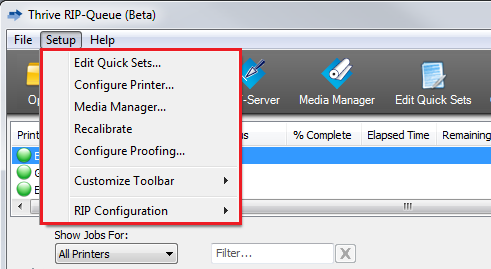 The Setup Menu in RIP-Queue gives you quick access to tools that let you control your printers, Quick Sets, toolbars, and other options.