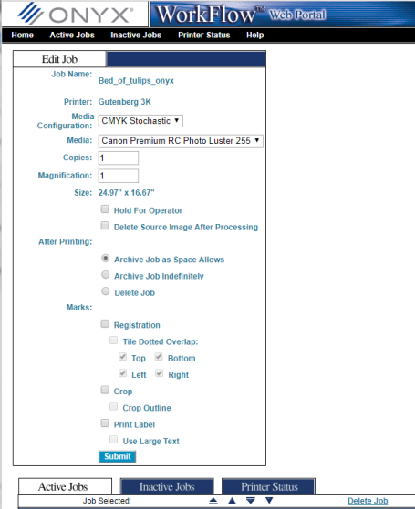 You can edit a job in the Web Portal by clicking on the job name. This opens the Edit Job dialog. You can modify many settings in this dialog including holds, number of copies, and magnification. Removing any holds from a job will automatically print the job.