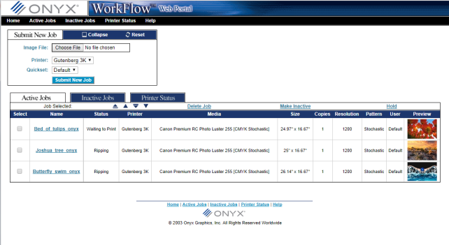 The Web Portal (Figure 1) allows you to send jobs to RIP-Queue from a remote computer on your local network. This includes sending images from Macs and other Operating Systems. In the Web Portal you can view the Active Jobs (equivalent to the Jobs Ready to Print area in the RIP-Queue window), the Inactive Jobs (equivalent to the Buffered Jobs Area in the RIP-Queue window), and even control many job options like number of copies, magnification, holds, and marks.
