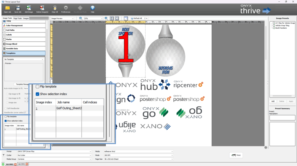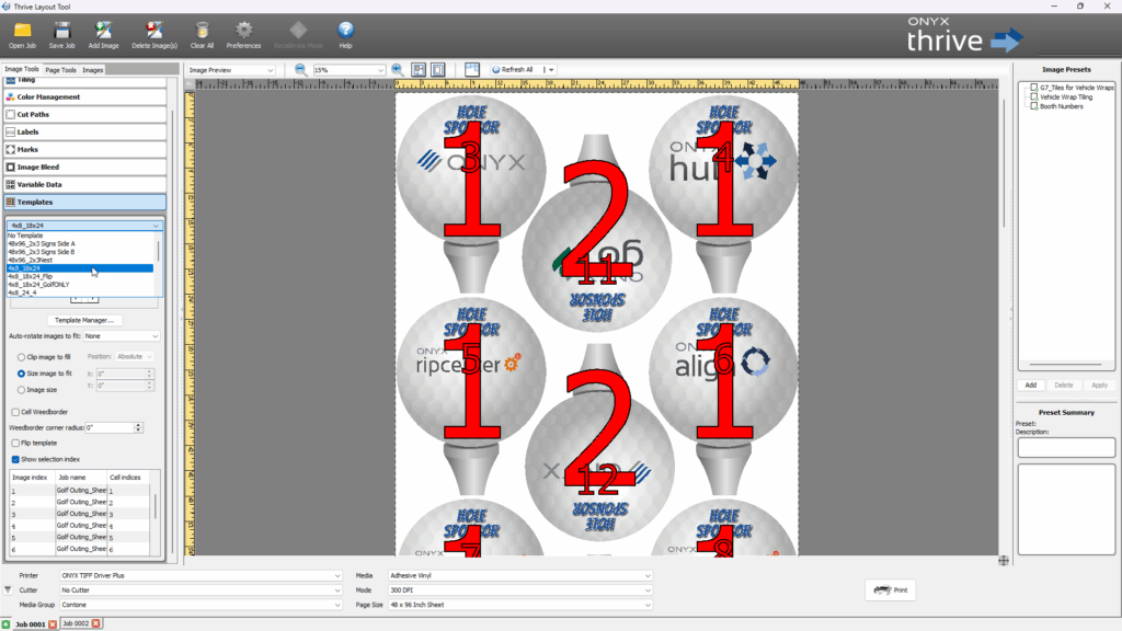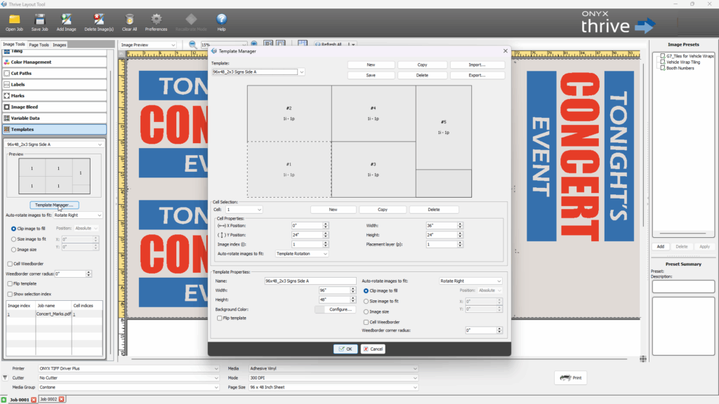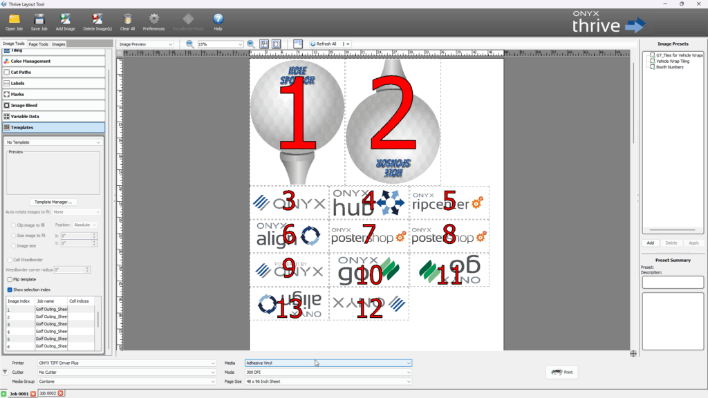 The Templates feature in the Image Tools panel allows you to automatically arrange and multiply images based on predefined layout templates. This is ideal for large-format printing environments where repeated image patterns, efficient material usage, and consistency are crucial — such as for posters, signage, decals, or product labels.