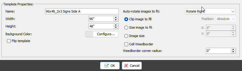 Template Properties – Set the template dimensions, name, background color, and default image fitting behavior.